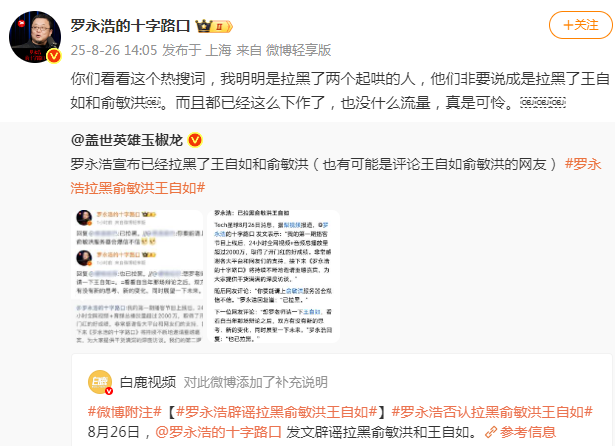 随后,#罗永浩拉黑俞敏洪王自如#话题引发热议,登上热搜。对此,罗永浩发文回应表示,明明是拉黑了两个起哄的人,他们非要说成是拉黑了王自如和俞敏洪。而且都已经这么下作了,也没什么流量,真是可怜。