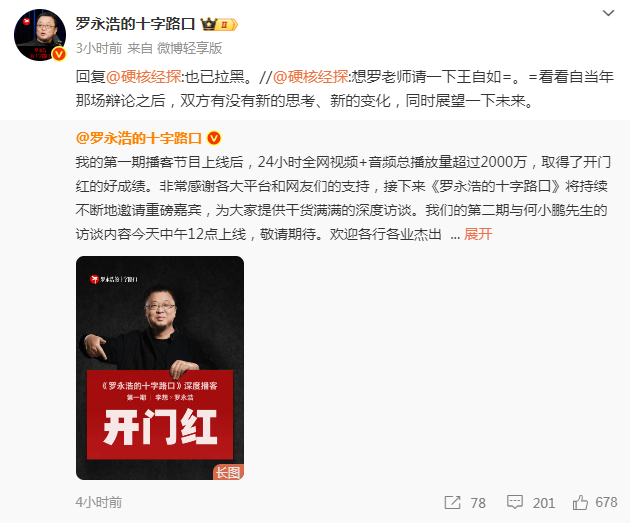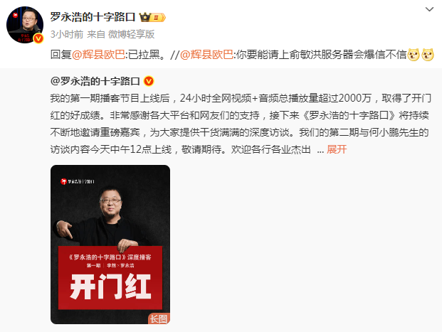 8月26日,罗永浩@罗永浩的十字路口公布首期播客节目的数据,24小时全网视频+音频总播放量超过2000万,取得了开门红的好成绩,其播客节目接下来将继续邀请重磅嘉宾。随后,有网友评论:“你要能请上俞敏洪服务器会爆信不信。”罗永浩回复:已拉黑。另一网友评论:“想罗老师请一下王自如,看看自当年那场辩论之后,双方有没有新的思考、新的变化,同时展望一下未来。”罗永浩回复:也已拉黑。